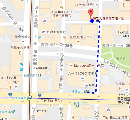 韓老大在忠孝SOGO後方,可搭捷運到忠孝復興站4號出口出來,步行5分鐘